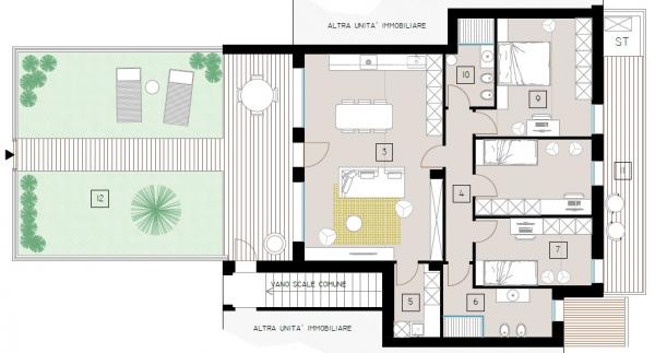 è costituita da un appartamento di soggiorno-cottura, tre camere, doppi servizi, terrazzo e giardino. Al piano interrato garage doppio in parallelo con tavernetta o cantina. Vasta la scelta dei materiali interni. Contesto di poche unità. Riscaldamento